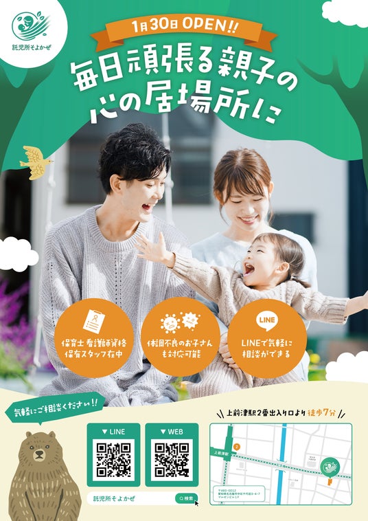 そよかぜ合同会社は「託児所そよかぜ」の開所を記念し1月30日(木)31日(金)にオープンイベントを開催します。本施設は有資格者が常駐し、お子様の体調に合わせ安心して利用できる保育施設です。