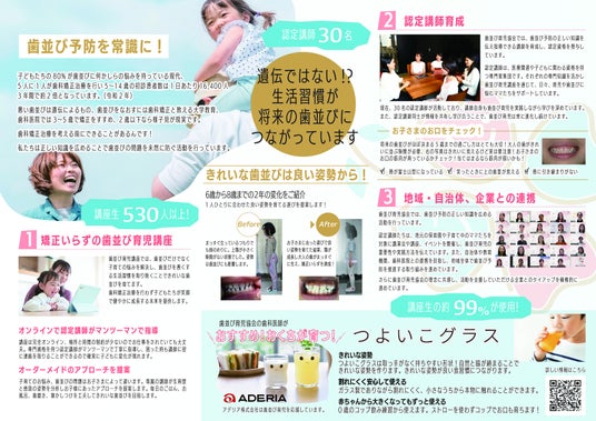 当協会は、妊娠・赤ちゃん期から「悪い歯並びを予防する育児」を広め、子どもの健康的な成長をサポートする活動を行っています。今回のギフトショーでは、アデリアの子ども向けガラス食器シリーズ「つよいこグラス」 を通じた健康支援についてもご紹介予定です。