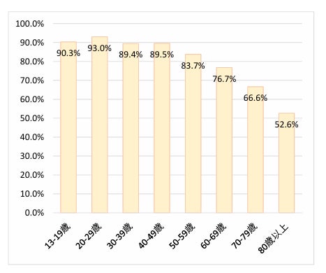 またインターネット利用者のうち、何らかのSNSを使用している割合は、20-49歳で約90%、50代で 84%、60代で77%、70代でも67%となっており、全年代でSNSの利用が広がっていることがわかります*注2。