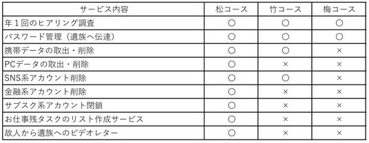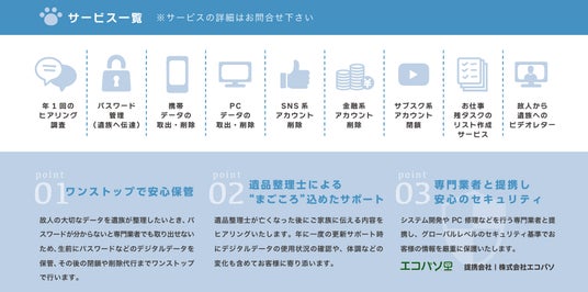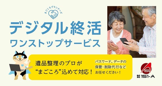 遺品整理「まごころプランナーズ」を運営する、株式会社151-A(いちごいちえ、所在地:静岡県三島市松本265-19、代表取締役:岡本 勝成 おかもと かつなり、以下 「当社」)は、2025年2月、エコパソ株式会社(所在地:静岡県三島市南田町3-19アイダ産業ビル1F、代表取締役社長:佐藤 良太 さとう りょうた)と提携し、デジタル機器のID、パスワード等のデータ保管から削除代行までを行う「デジタル終活ワンストップサービス」を開始いたします。