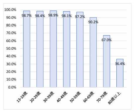 現代において、インターネットは日常生活に欠かせない存在となり、多くの人々に利用されています。インターネット利用者は、20-69歳の各年齢層で90%を超えており、70代でも67%に上ります*注1。