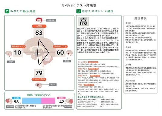 「B-BRAIN」は脳医科学の臨床現場から開発された診断テストとなっています。80問の設問に答えることで、「脳タイプ」と「脳活用度(メンタル状況)」が数値化された診断結果が出ます。