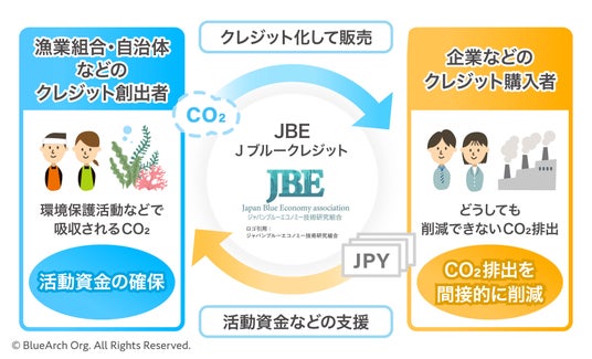 ジャパンブルーエコノミー技術研究組合 (JBE)が独立した第三者委員会の審査を経て認証・発行・管理する独自のクレジットで、沿岸域・海洋に貯留されるCO2の量を客観的方法論に基づき科学的合理的に算定し、これを認証・発行することにより排出量取引を可能にする仕組み
