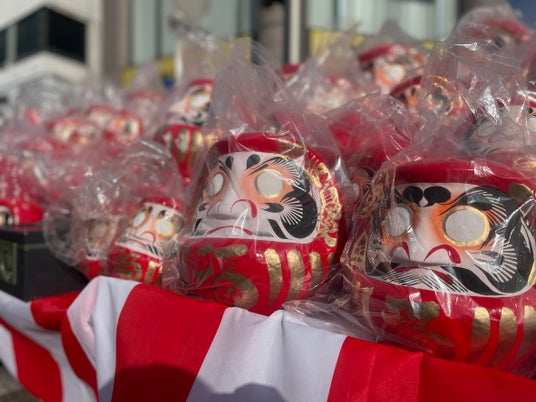 熊谷初市(だるま市)とは 熊谷初市は中山道の宿場町として栄えた熊谷宿の繁栄を願って始まりました。だるまは禅宗の開祖である達磨大師が座禅を組んでいる姿を表しており、何度も倒れても起き上がる姿から、「七転び八起き」の象徴として、目標に向かって努力を続ける人々に勇気を与える存在とされています。
