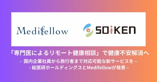 株式会社総医研ホールディングス(本社:大阪府豊中市、代表取締役:角田 真佐夫、東証グロース:2385)は、株式会社Medifellow(本社:東京都港区、代表取締役CEO:丹羽崇)との業務提携を発表いたします。この提携により、国内企業の社員から海外からの旅行者まで、幅広い利用者に対応可能な専門医によるリモート健康相談サービスを提供いたします。