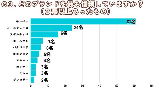 最も信頼されるブランドは「モンベル」(61票)で、次いで「ノースフェイス」(24票)が支持を集めました。その他のブランドとして、コールマン (7票)、スポルティバ (6票)、パタゴニア (6票) などが挙げられます。