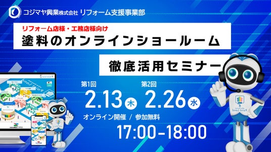 コジマヤ興業株式会社(本社:静岡県袋井市 代表取締役:坂井 秀徳)は、「塗料のオンラインショールーム活用オンラインセミナー」を2025年2月13日(木)・2月26日(水)に開催いたします。