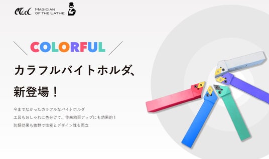「カラフルバイトホルダ」は、切削工具のバイトホルダに画期的なカラーバリエーションを採用。赤、青、白、緑、紫の5色展開により、工程や用途ごとに色分けが可能で、視認性向上による作業ミスの削減が期待できます。また、カラーコーティングによる防錆効果や、精密な刃先設計による高い加工精度も備えています。