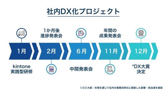 DX化プロジェクトは、年初に研修を実施し、半年後と年末に、kintoneアプリの活用状況を発表する報告会を開催します。最終報告を踏まえて「DX大賞」として優れた成果を表彰する予定です。