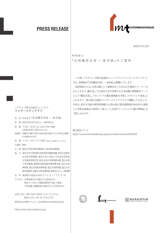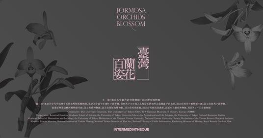 本特別展示では、台湾の蘭という植物をめぐる日台の学術的ストーリーをひもときます。蘭を巡っては東京大学が所蔵する日本産蘭の植物画をテーマとした『蘭花百姿』、コロンビアの蘭花植物画を考察した『カトレヤ変奏』とこれまでに二度の展示企画をインターメディアテクにて開催してきました。今回は、東京大学総合研究博物館と台湾の国立歴史博物館が2024年に締結した学術交流協定の成果の一部として、台湾ヴァージョンの「蘭の博物誌」をご覧に入れます。