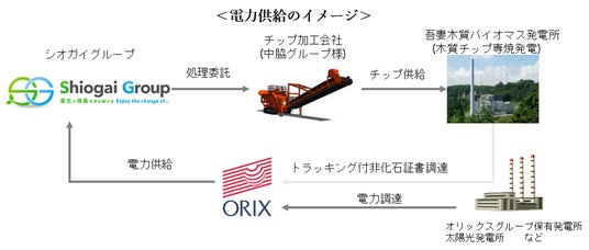 当社が使用するグリーン電力は、オリックス株式会社(本社=東京都港区、社長:高橋英丈、以下、オリックス)から購入しています。オリックスは、木質チップ専焼の吾妻木質バイオマス発電所(群馬県)で発電した電力の非化石証書をシオガイグループに提供します。また、吾妻木質バイオマス発電所では、当社が選別・加工した木材を中脇グループ(本社=埼玉県八潮市、中脇周一社長)に処理委託し、チップ化したものを発電用燃料として使用しています。これにより、当社が使用する電力の一部は、廃棄物を燃料として発電された電力で賄われており、廃棄物を燃料化し、その燃料で発電し、発電した電力を使用するという資源循環ループを実現しています。