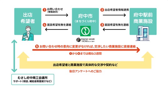 府中市とまちづくり府中(所在地:東京都府中市、代表取締役:槇ヶ垰俊一)は、京王線府中駅前エリアの更なる活性化を目指し、府中駅前の商業施設に出店を考えている事業者と各商業施設とをつなぐ事業を開始しました。 まちづくり府中のサイト内・府中駅前商業施設出店者マッチング事業ページの「出店の相談をする」から必要事項を入力、送信することで、各商業施設に出店希望を伝えることができます。