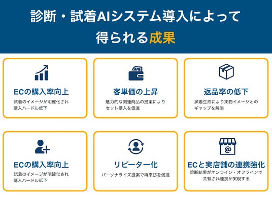 本サービスはアパレル事業者向けに、EC連携・店舗導入も視野に入れた実証を行い、スタッフの提案力強化・服販売率の向上・顧客満足度アップを実現。リスキリング支援や補助金の活用により、負担を軽減させた導入試験も提供しています。