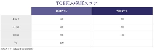 今までは現在の英語力や学習状況に応じて個別に保証スコアを提示していましたが、過去の実績をもとにスコアアップや合格の基準を明確化し、業界初となる主要英語試験すべてで最高ランクとされるTOEIC 900・IELTS 7.0・TOEFL 100・英検1級の保証を発表する運びとなりました。