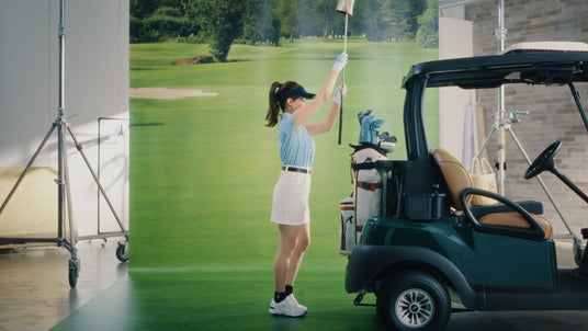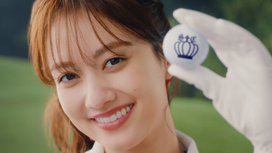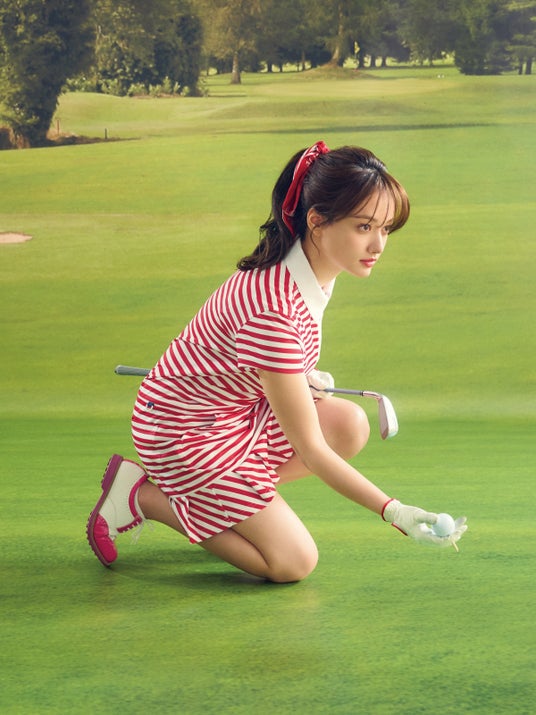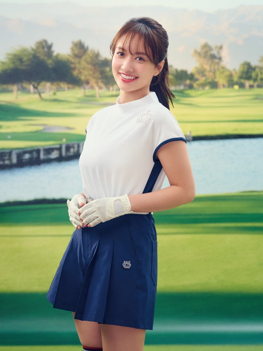 谷さんの見事なスイングが、ゴルフシーンの華やかさを一層引き立てるほか、胸元に輝くクラウン型のストーンをはじめ、各アイテムの細部にまでこだわった美しいディテールにもご注目ください。