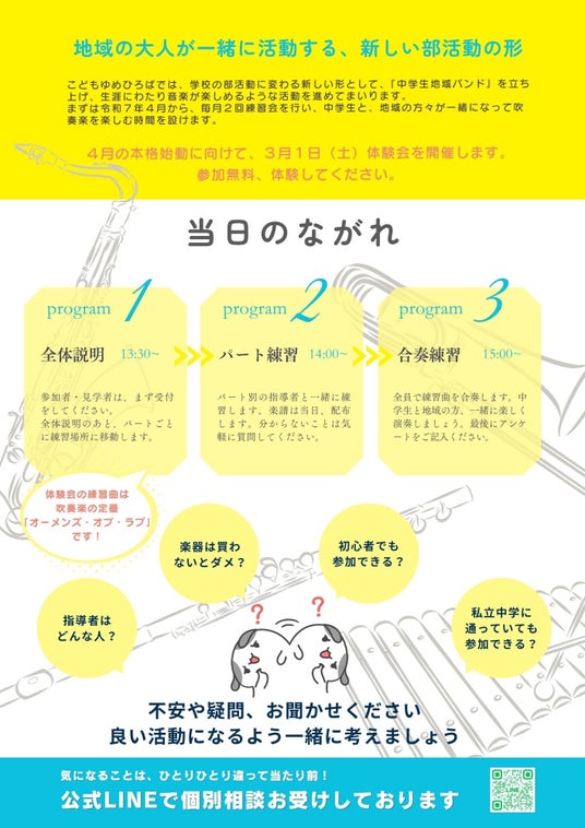 こどもゆめひろばでは、学校の部活動に代わる新しい形として、「地域音楽クラブ・中学生吹奏楽団」を立ち上げ、生涯にわたって音楽が楽しめるような活動を進めてまいります。この取り組みは、地域の専門家やボランティアの協力を得て、質の高い指導を提供し、子どもたちが音楽を通じて成長する機会を提供します。