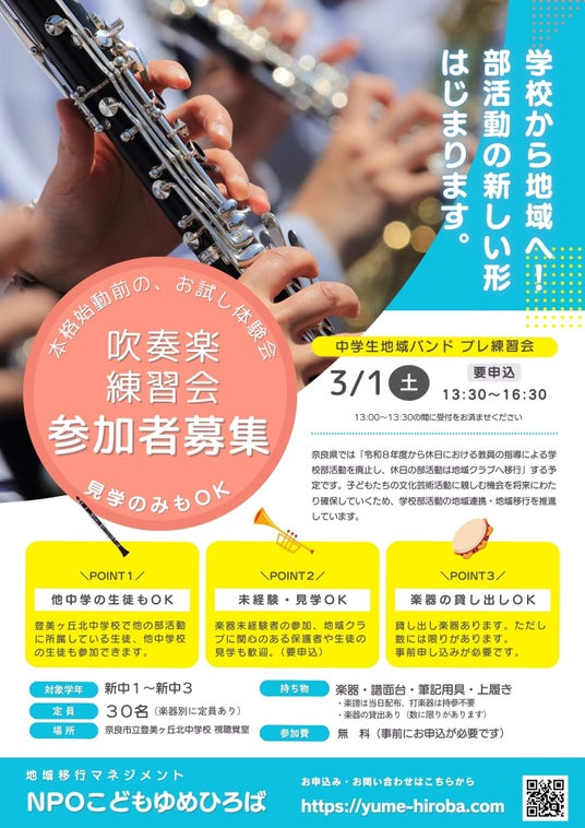 このたび、こどもゆめひろばは、令和8年度から始まる「部活動の地域移行(地域展開)」に向けたプレ練習会を開催いたします。このイベントは、奈良市教育委員会、奈良県吹奏楽連盟、奈良市立登美ヶ丘北中学校の協力の下実施され、地域クラブの立ち上げに向けた重要なステップとなります。