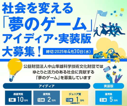 中山隼雄科学技術文化財団では、2013年から様々な社会的課題を「ゲームの面白さや手法 を使って、みんなでゲームを楽しみながら協力して解決していけるような、新しいゲーム=【夢のゲーム】」のアイディアを募集してきました。自由な発想でアイディアを考えてもらうことが趣旨で、これまですばらしいアイディアをたくさんご応募いただいています。募集期間は3月14日~4月30日まで。応募対象者は小学生から一般の方までです。今年度も昨年に引き続き【夢のゲーム】のアイディアと昨年度から募集を開始して多数の意欲的な応募を頂いた実装版を募集いたします。 皆様からのご応募、お待ちしております。