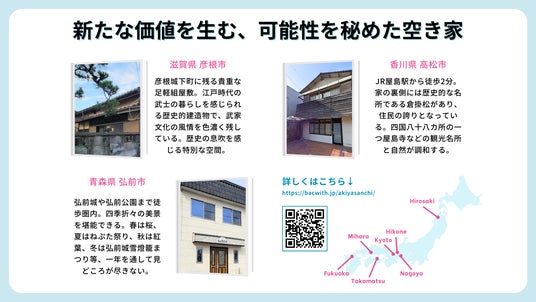 BACwithは社会課題解決支援を根幹に据え、地域課題解決のための施策「空き家問題」に取り組んでいます。日本全国の空き家を対象に、10~40代を中心にした空き家活用施策のアイデアコンテストを実施しています。採用者には、地元企業をはじめとする協同資本投資を行い、また行政や地域、企業の知恵や技術を集めた各種支援も実施。 空き家を起点にした自律的な地域創生のエコシステム創出を目指し、 空き家をつくらず機会をつくる仕組みを全国に広げていきます。