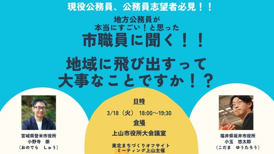そんな疑問に「地方公務員が本当にすごい!と思う地方公務員アワード」を受賞されたお二人の現役公務員を山形県上山市へお呼びし、体験談を交えつつ直接お応えいただきます。