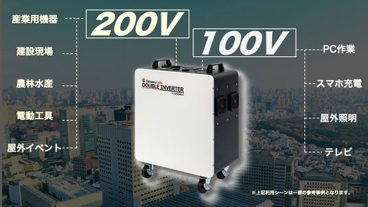 「タメルラボ.ダブルインバーター」はその名の通り100Vと200Vの2基のインバーターを搭載した市場に無い新しい構造の製品です。一般的には家庭含め100V環境下での負荷機器が主流ですが、産業用途では200Vの負荷機器が使用されるシーンも少なくありません。その中でも200Vの場合は3KWから6KWという大電力を必要とする機器がほとんどです。この100Vと200Vを同時にフルパワーで出力したいという業界のニーズにお応えして開発製造し発売に至りました。