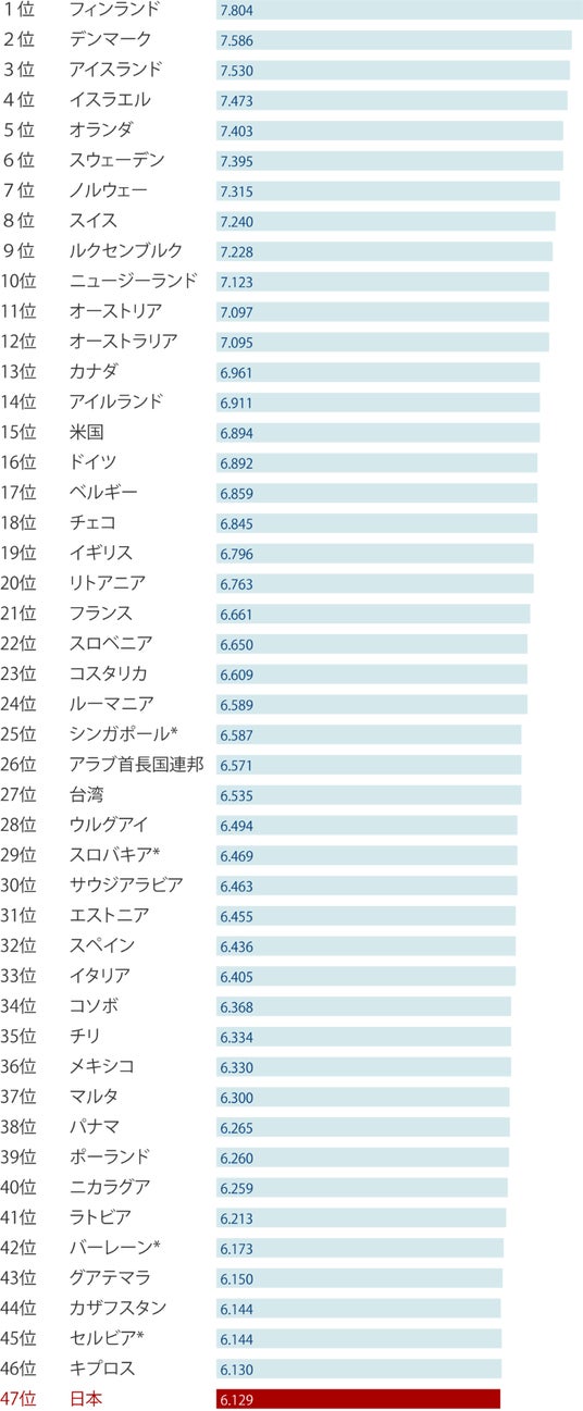 「World Happiness Report(世界幸福度報告書)」の2023年版国別の幸福度ランキング