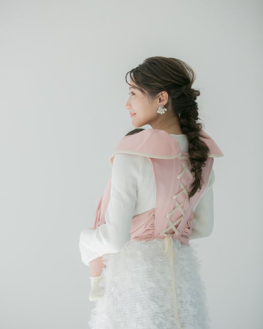 特徴:背面の編み上げデザイン、フロント部分にはフラワーモチーフをあしらった上品でフェミニンなデザイン