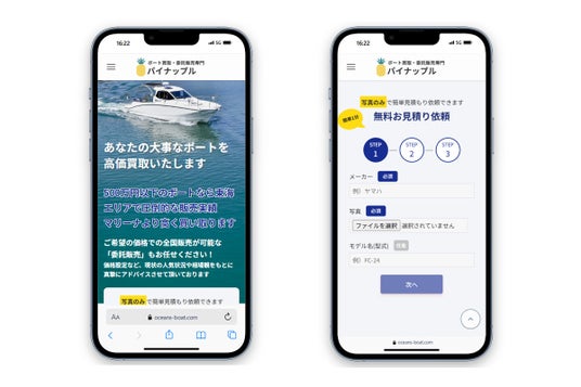 オーシャンズ(所在地:愛知県西尾市、代表:牧伸一)は、ボート買取・委託販売専門サイト『パイナップル』を正式にリリースしました。全国対応で、スマホで撮った写真を送るだけの最短1分で無料査定依頼ができる便利なサービスです。