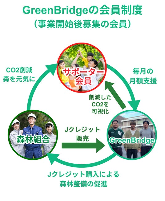 森林組合からJクレジットを仕入れ、小口化してサポーター会員に提供することで、CO2削減を実現する仕組みを構築しています。森林組合は、森林の保全や育成を行う重要な役割を担っています。しかし、森林組合は、担い手不足や資金不足などの課題を抱えているケースも少なくありません。そこで、GreenBridgeがJクレジットを仕入れることで森林組合の収益向上につながります。そして、GreenBridgeはJクレジットを小口化することで、個人でもCO2削減に取り組みやすい仕組みを提供します。