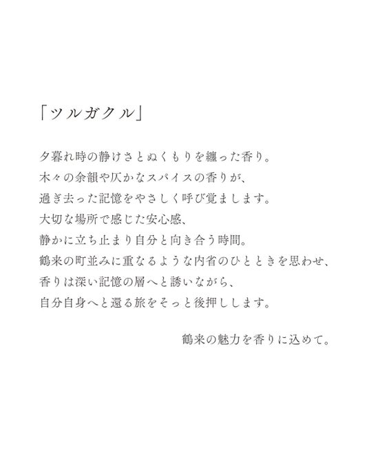 静かに陽が落ちる。時の流れがゆるやかになり、深まる夕暮れが香りとなる。木々が静かに語る温もり、遠い記憶の断片がふと蘇る。自分を見失いそうなとき、迷いながらも立ち止まり、心の声に耳を澄ませる。時を超えて、確かにここにいるという感覚。鶴来の町並みが映す、静かな内省のひととき。この香りは、心の奥深くに潜む記憶を辿りながら、自分自身へと還る旅へと誘う。