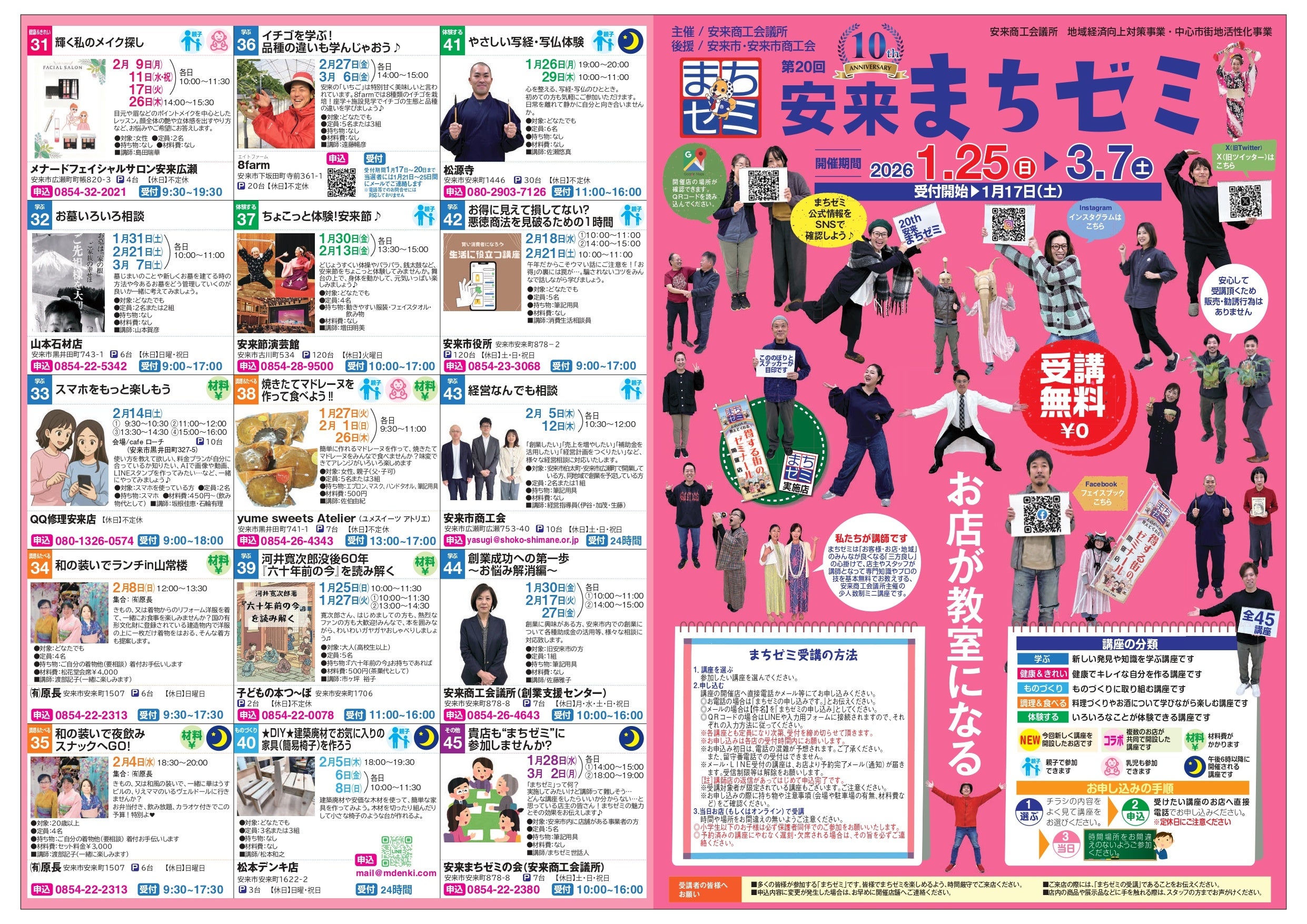 島根県安来市の「安来商工会議所(会頭:並河元)」は、地元商店の店主が講師となり、専門知識を無料で提供する少人数制ゼミナール「第20回安来まちゼミ」を2026年1月25日(日)より開催いたします。本事業は今回で実施10周年、20回目の節目を迎え、実施回数は山陰両県で最多となります。今回は新規9店舗を含む全45講座が開講され、市役所や商工団体も講座を受け持つ「官民一体」の地域活性化事業として展開します。