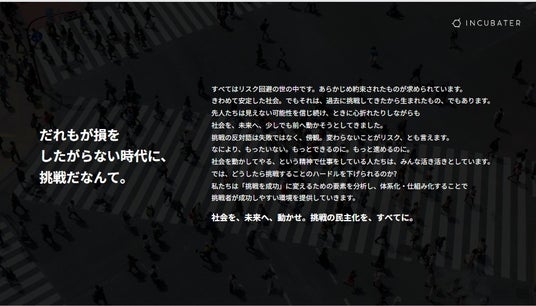 今回のサイトリニューアルを通じて、インキュベーターが提供する価値や世界観をより明確に伝え、ステークホルダーの皆様とのコミュニケーションを一層強化することで、ミッションの実現を加速させることを目的としています。