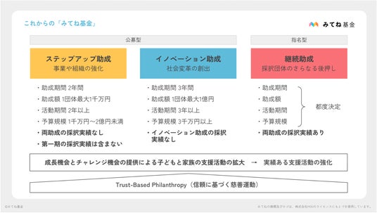 これまでのステップアップ助成(2年間、1団体最大1千万円、事業や組織の強化)、イノベーション助成(3年間、1団体最大1億円、社会変革の創出)の支援機会を通じて、“さらに支援したらより素晴らしい取り組みになるのに”“支援期間終了後も支援を続けたい”という「みてね基金」の想いを形にした新たな助成プログラム「継続助成」を開始します。