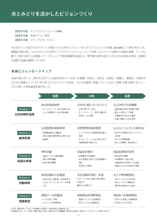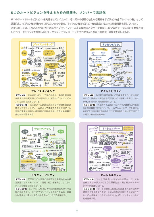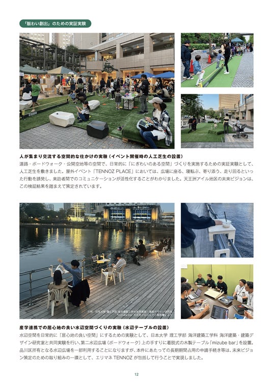 今回公開した資料『水とみどりとヒカリの楽島 天王洲の今と未来 ~官民連携のまちづくり「水とみどりの天王洲エリアプラットフォーム」活動記録~』には、天王洲アイル地区が今のまちの形となるまでの歴史的変遷から、「水とみどりのエリアプラットフォーム」が2023年に策定したまちづくりの指針となる未来ビジョンの内容、そのビジョンを実現するためのための各種取り組み事例までを集約。これを読めば天王洲アイルで行われてきたまちづくりの概要がつかめるようになっています。