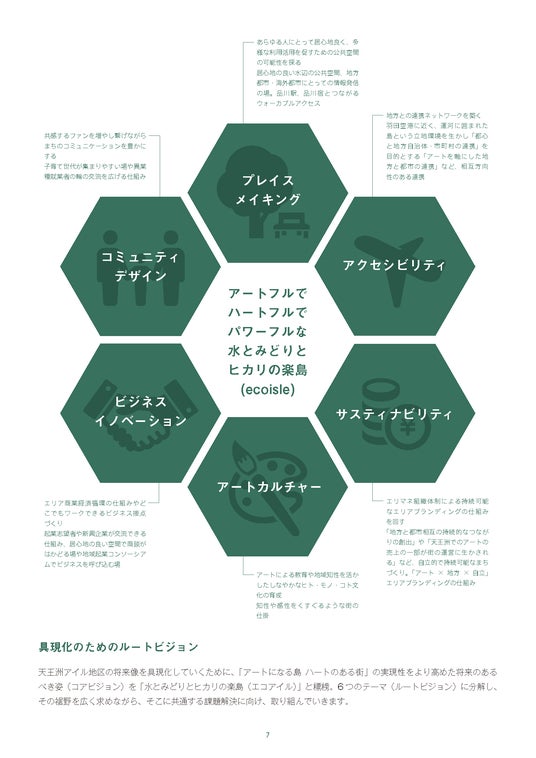 1:官民が連携し、水辺、緑化の整備を行い、街なかのアート作品やアート施設と融合することで独自の景観を形成し、アートになる島の実現を目指す。