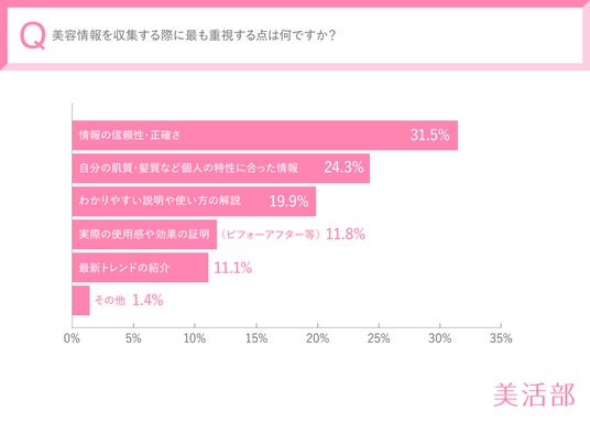 トップ3: 1.情報の信頼性・正確さ 31.5% 2.自分の肌質・髪質など個人の特性に合った情報 24.3% 3.わかりやすい説明や使い方の解説 19.9%