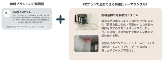 市町村にPRしたい自社の技術や実績を2テーマまで掲載が可能です。自社のアカウントを閲覧した市町村の履歴(足跡)を確認することができますので、自社に関心を持ってくれた市町村への営業に集中して頂くことができます。以下の図は、PRプランで掲載していただく情報のイメージです。