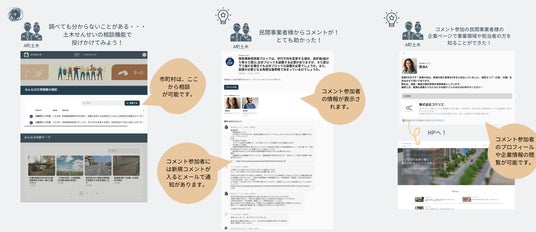 市町村ユーザーが投稿した日常業務の中での困りごとに対して、自社のノウハウでサポートできるものへコメントをすることが可能です。コメントをすると、ページ内に担当者および企業名が表示されるので、自社をアピールすることができます。営業の方々が市町村を訪問した際に起きるやりとりをWEB上で行なって頂くことができるため、効率的な営業を行なって頂くことができます。