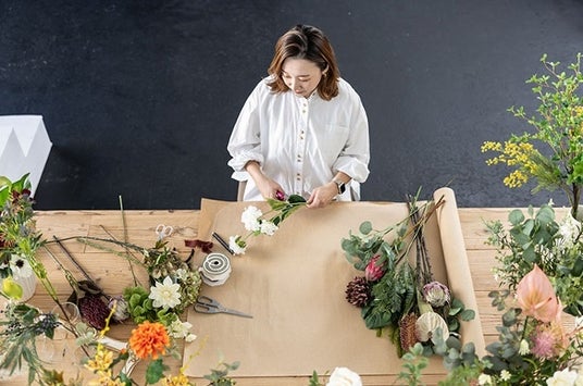 再生プラスチック素材を使用した花材など、サステナビリティを重視し、アレルギーや匂いが
