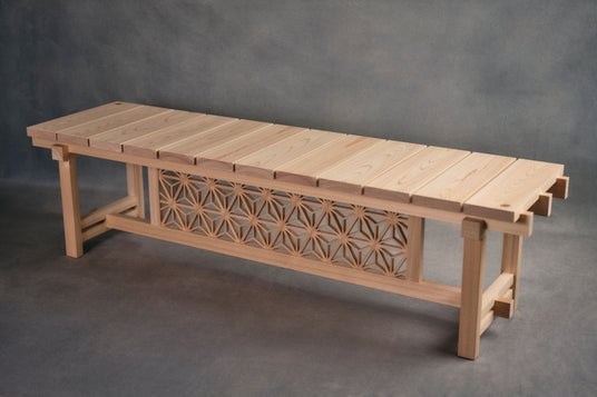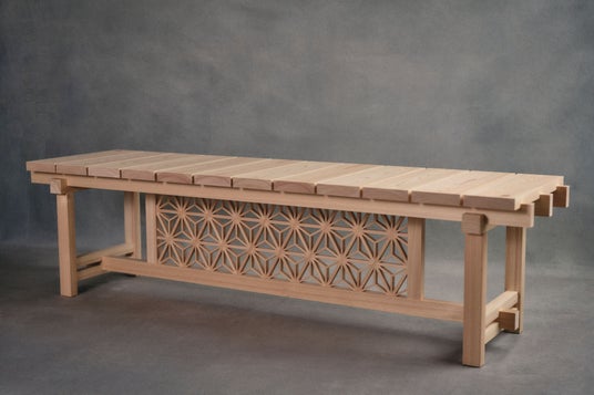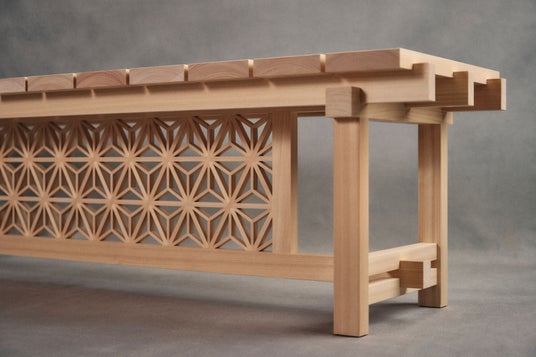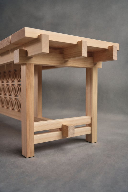 ベンチは大阪万博の関西パビリオン滋賀県ブースのベンチとして展示されます。麻の葉模様の組子が映えるデザインとし、建具の技術で釘を使わず組み、組子の三ツ組手がベンチの荷重を支えます。