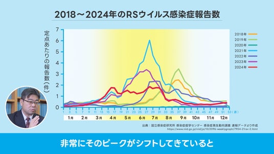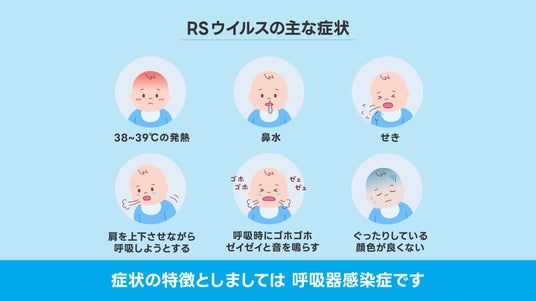 RSウイルス感染症は、2歳までにほぼすべての子どもが感染するウイルス感染症であり、風邪に似た症状から始まりますが、乳児では肺炎や細気管支炎などの重症化を引き起こすことがあります。とくに生後6か月未満の乳児は重症化のリスクが高く、日本では毎年約10万人以上の乳幼児がRSウイルスで医療機関を受診しています。