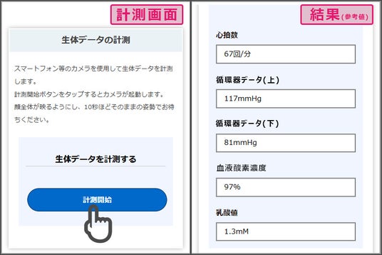 スマートフォンやPCの内蔵カメラなどを使い、体に触れることなく生体情報が分かる技術です。心拍数や血中酸素濃度など、4種類の生体情報が取得できます。