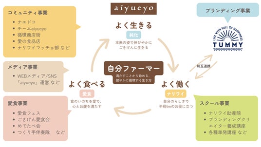 具体的な事業として、いのちのつながりを感じ、心もお腹も満たされる食体験「愛食」の商品やイベントの企画・販売事業者、いのちのらしさを応援するためのスキル習得を目指す「スクール事業」、愛本主義の発信を行う「メディア事業」を運営。コミュニティ内では、個人のらしさを活かしたお商売を実験・練習するための「循環商店街」を運営。