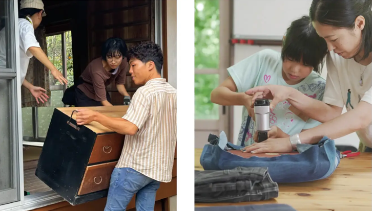 島内で使われなくなった約360点の家具や80kgの古着、建築廃材を回収し、町民・職人・子どもたちと共にリメイク。
