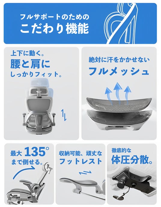 デスクワークの三大悩み『首・肩・腰』を解消する最先端オフィスチェア!『リラックス×集中力』2モードの切り替えができて、どんな体型の人にもフィットする。最大50%オフで手に入るお得なチャンス。