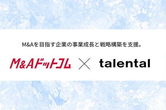 「M&Aを次世代の成長エンジンに変え、日本の産業を活性化する。」をコンセプトに掲げ、M&Aアドバイザリーサービスを提供するM&Aドットコム株式会社(本社:東京都渋谷区、代表取締役:藤澤専之介)は、この度、BizDev(事業開発)人材のレンタルサービスを展開するtalental株式会社(本社:東京都渋谷区、代表取締役社長:武田 直人)と事業提携を行うことをお知らせいたします。