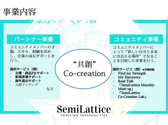 セミラティスの事業内容は、大きく分けて2つ。企業との”共創”と、コミュニティメンバー同士の”共創”をサポート