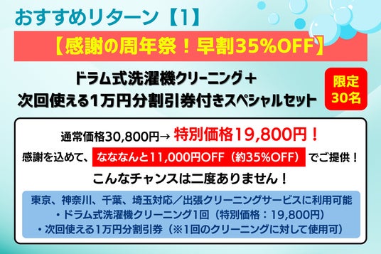 1.【超早割35%OFF】ドラム式洗濯機クリーニング+次回使える割引券1万円分