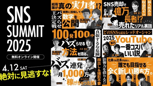 株式会社BUZZ(本社:東京都新宿区、代表取締役:溝口 優也)は親会社である株式会社SAKIYOMI(本社:大阪市北区、代表取締役社長:吉田 睦史)と共に、2025年4月12日(土)に「SNSサミット2025 ONLINE」を開催いたします。