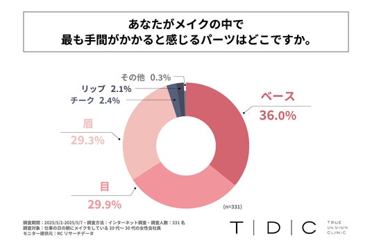 また、「メイクの中で最も手間がかかると感じるパーツはどこか」を尋ねる設問への回答では、1位が「ベース」で36.0%、2位が「目」で29.9%、3位が「眉」で29.3%という結果になりました。この結果から、メイクの中で最も手間がかかると感じるパーツは、「ベース」ということが明らかになりました。